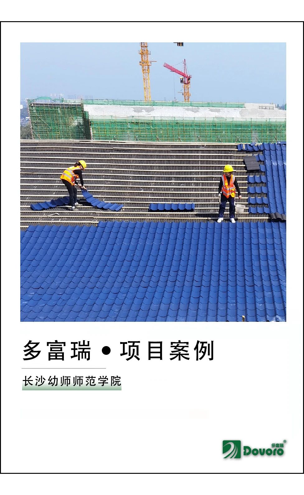本项目为长沙幼师高等专科学院,使用“幻彩”波形沥青瓦和波形沥青防水板组合施工,总施工面积约40000平米。