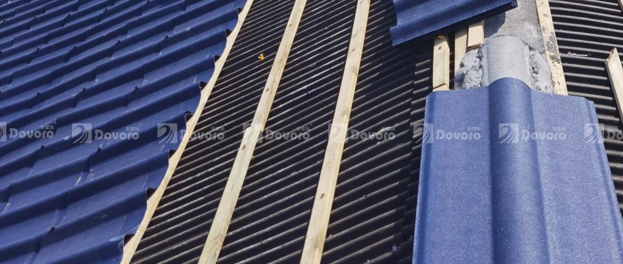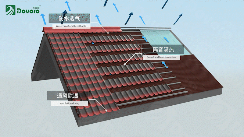 “幻彩”波形沥青瓦与波形沥青防水板组成轻质坡屋面系统,集轻质、防水、透气、隔热、静音、施工便捷等优点为一身。