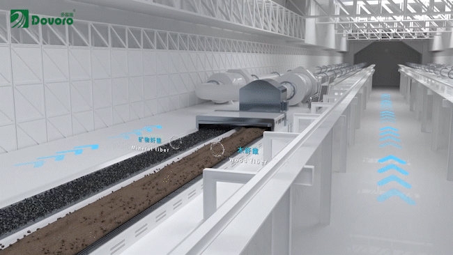 我们在里面加入矿物纤维,然后将木纤维与矿物纤维的混合物一起送入纤维搅拌罐。