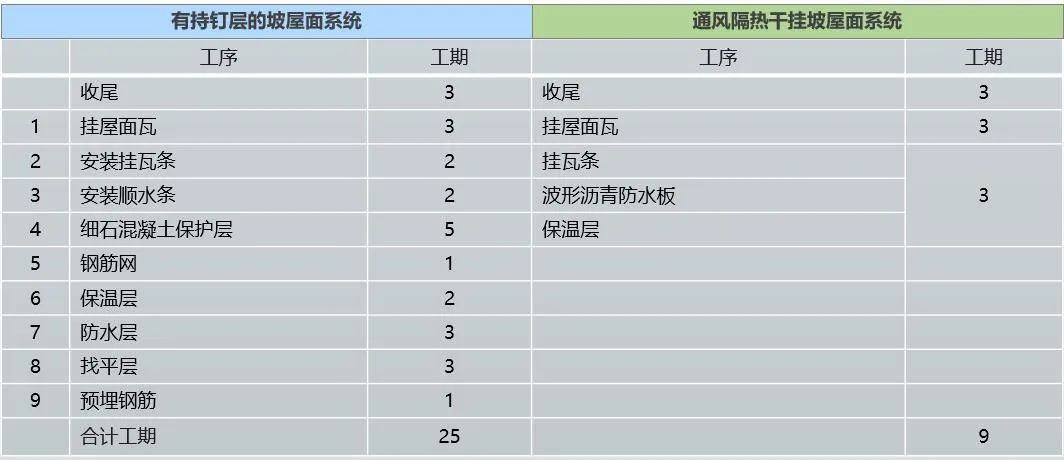 轻质坡屋面系统施工极为方便,在屋面基层上铺设保温层、波形沥青防水板,使用挂瓦条加以固定,再铺设屋面瓦即可。以200平坡屋面为例,传统的有持钉层的坡屋面系统,需要25天的工期,而轻质坡屋面系统仅需9天,约为传统坡屋面做法的三分之一。
