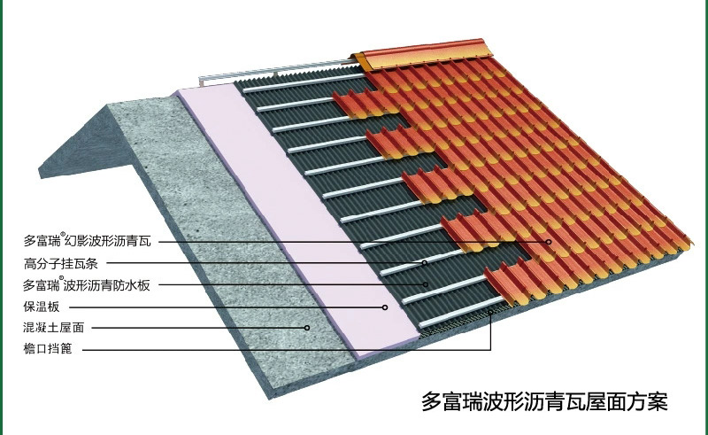 防水板是由植物纤维、矿物纤维和沥青结合而成的复合新型波形防水材料,除自身具备防水性能外,还起到通风、除湿等辅助作用,最重要的是在不影响自身性能的前提下把混凝土基层、保温层和屋面瓦快速有效地整合起来。